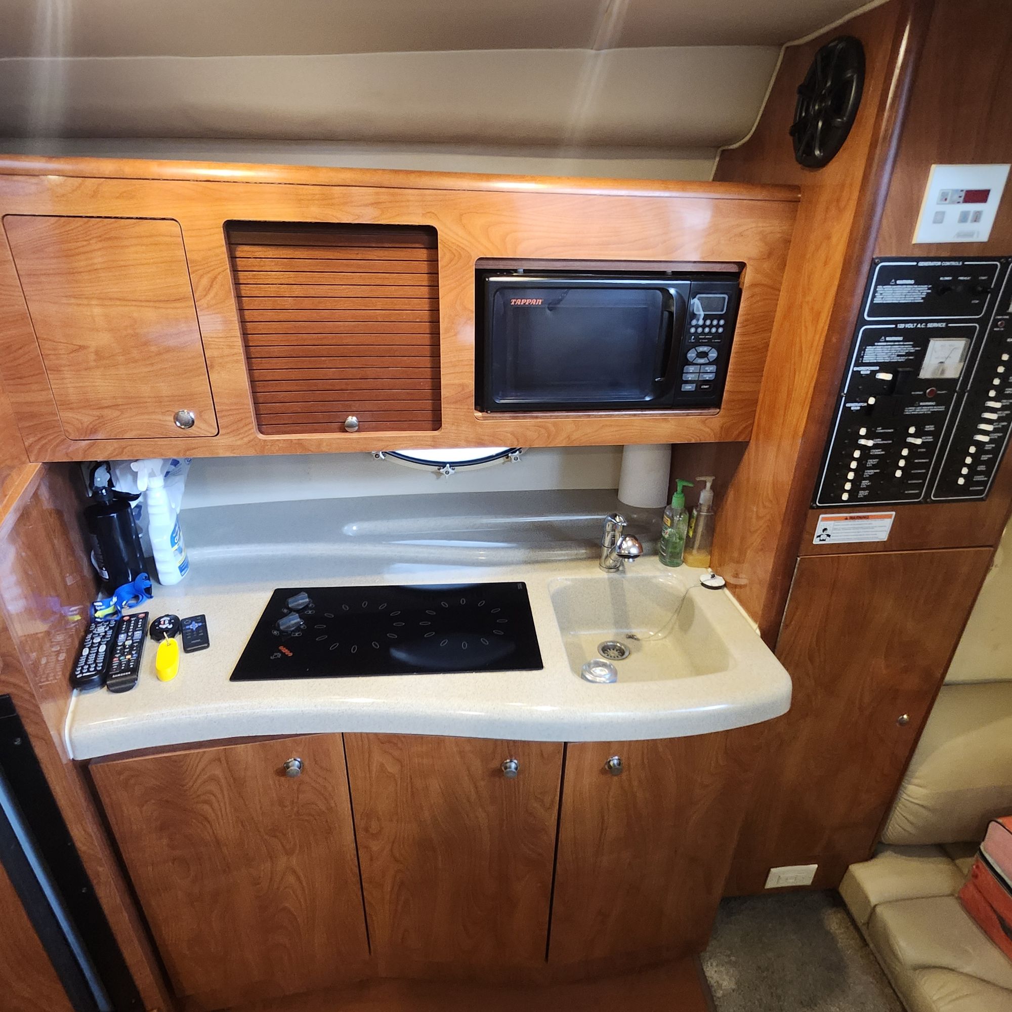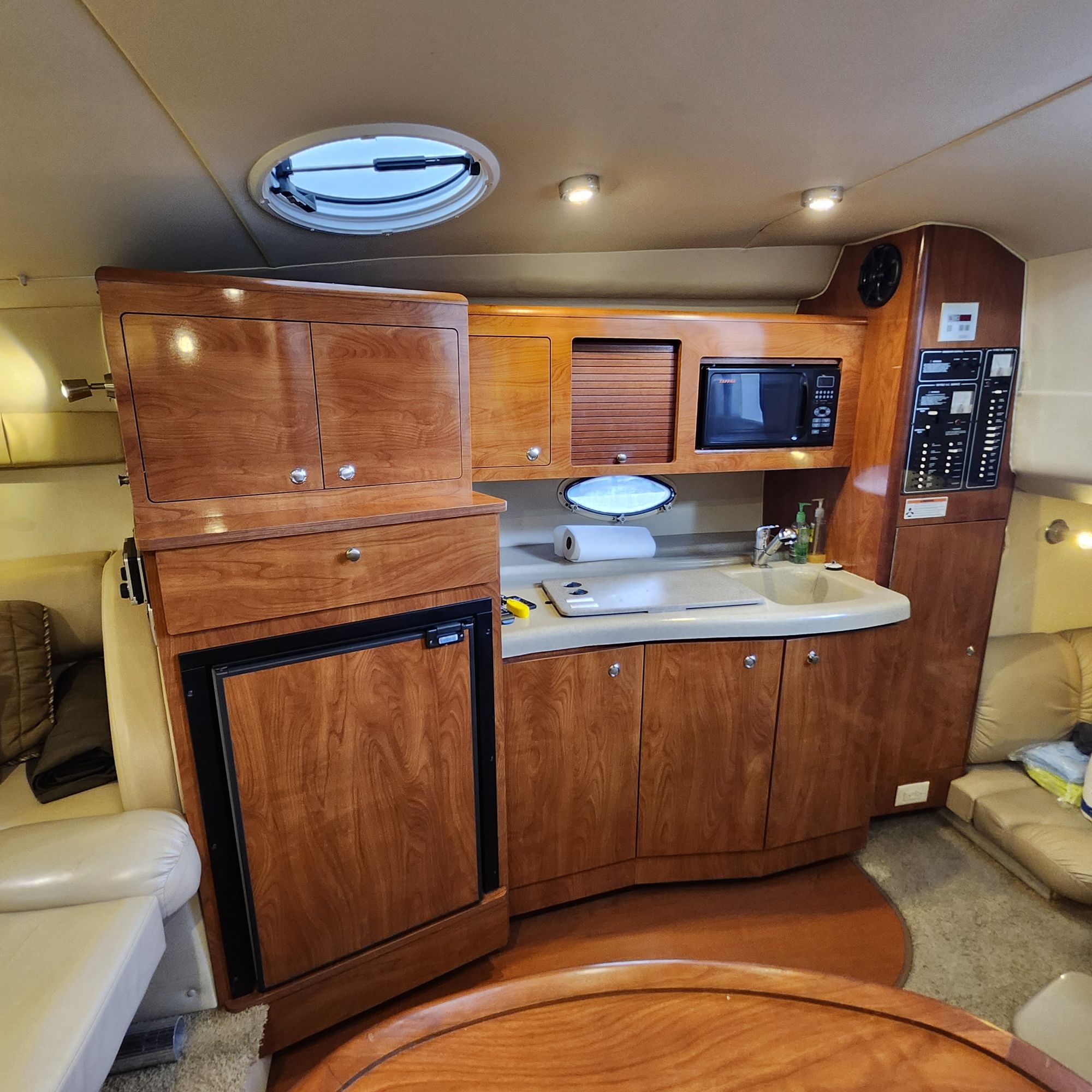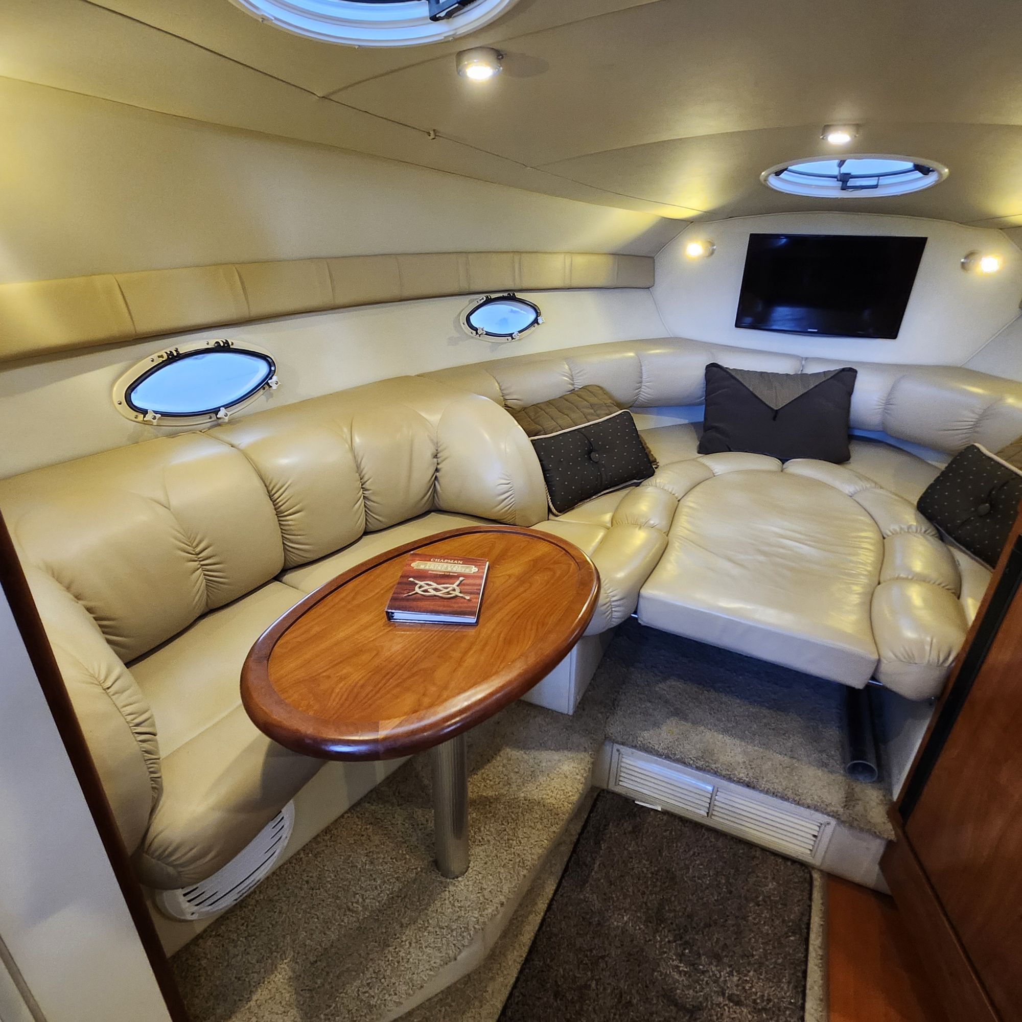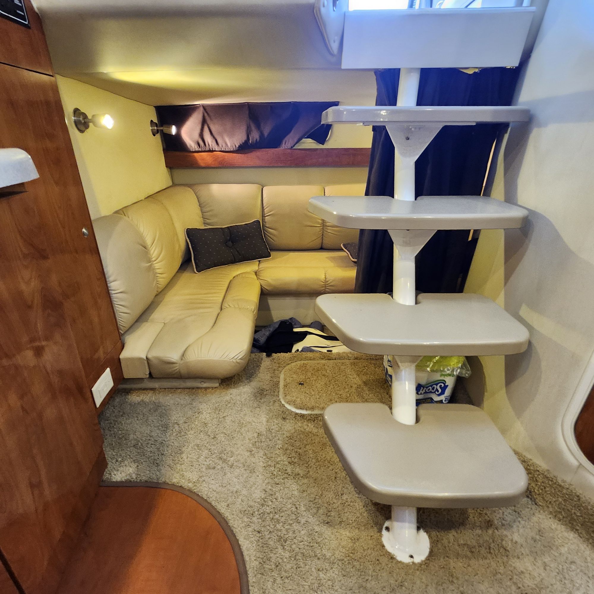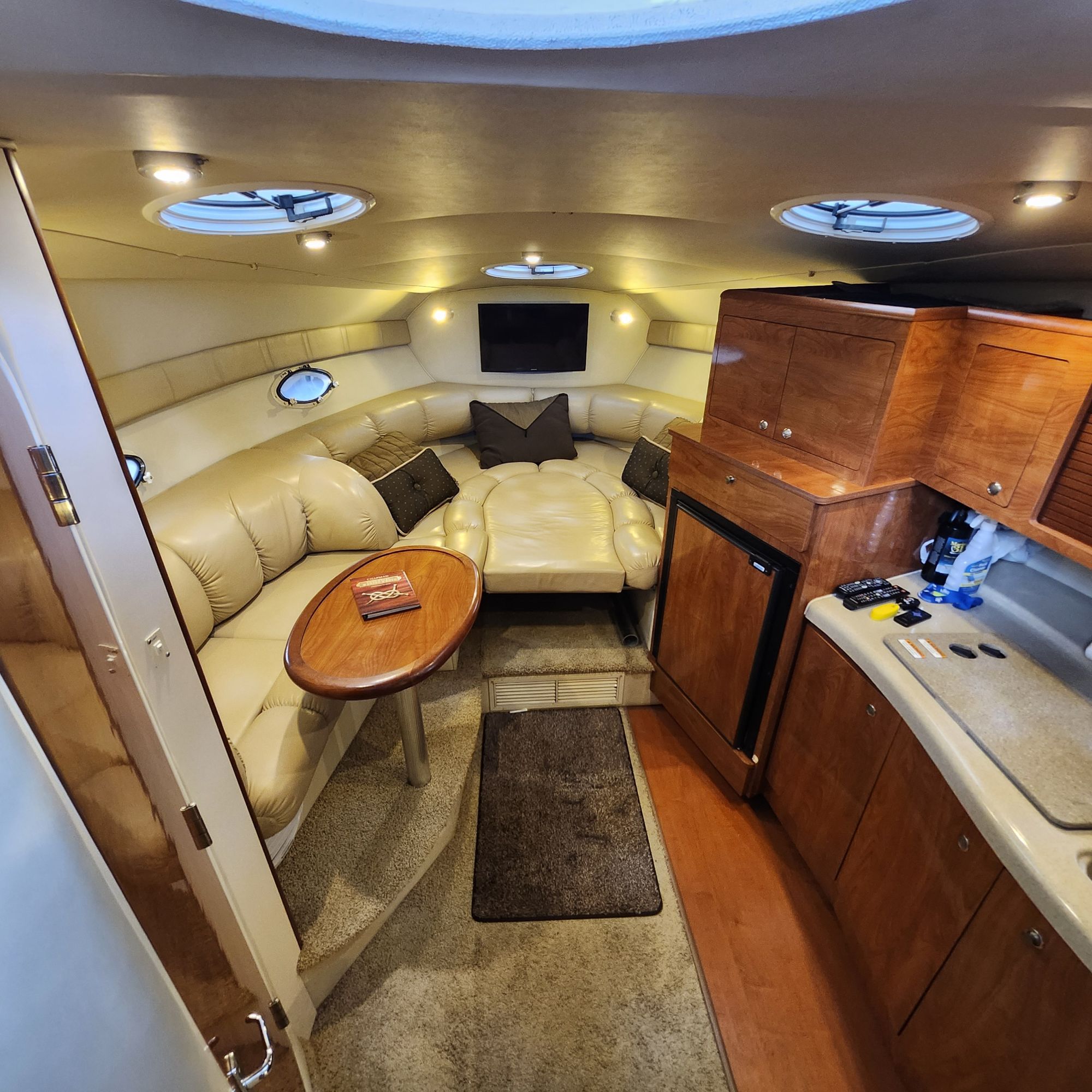 The cockpit is equipped with a full isinglass enclosure, making this an ideal four-season cruiser and extending your time on the water well into the fall months. A walk-through windshield provides convenient access to the bow, and an anchor windlass adds ease and convenience when anchoring. The boat has just been professionally buffed and waxed and presents in truly outstanding condition — she’s a head-turner at the dock.
